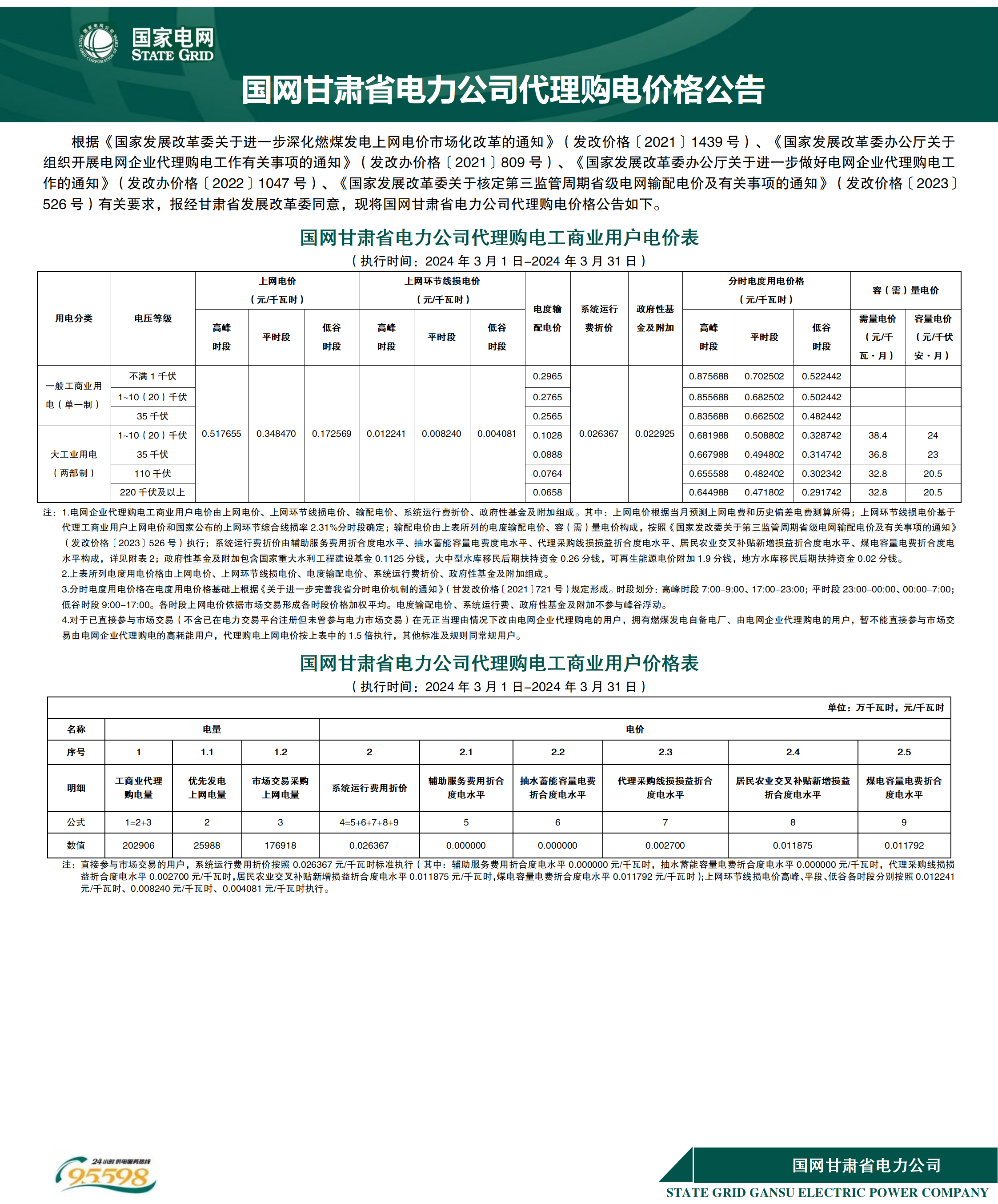 甘肅省3月份代理購(gòu)電工商業(yè)用戶電價(jià)表