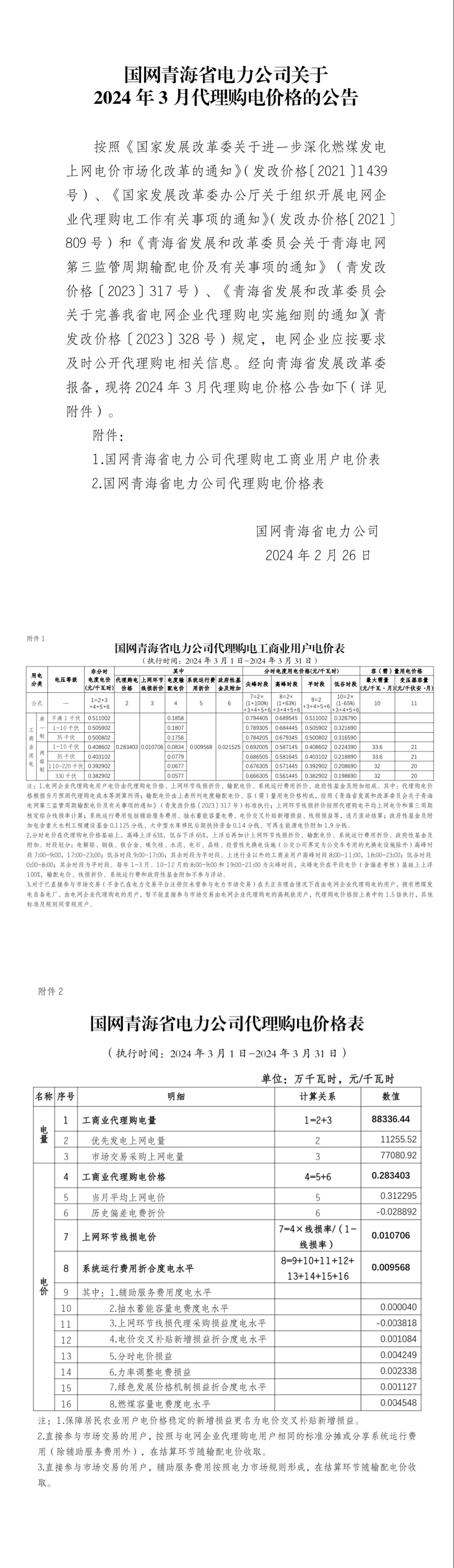青海省3月份代理購(gòu)電工商業(yè)用戶電價(jià)表
