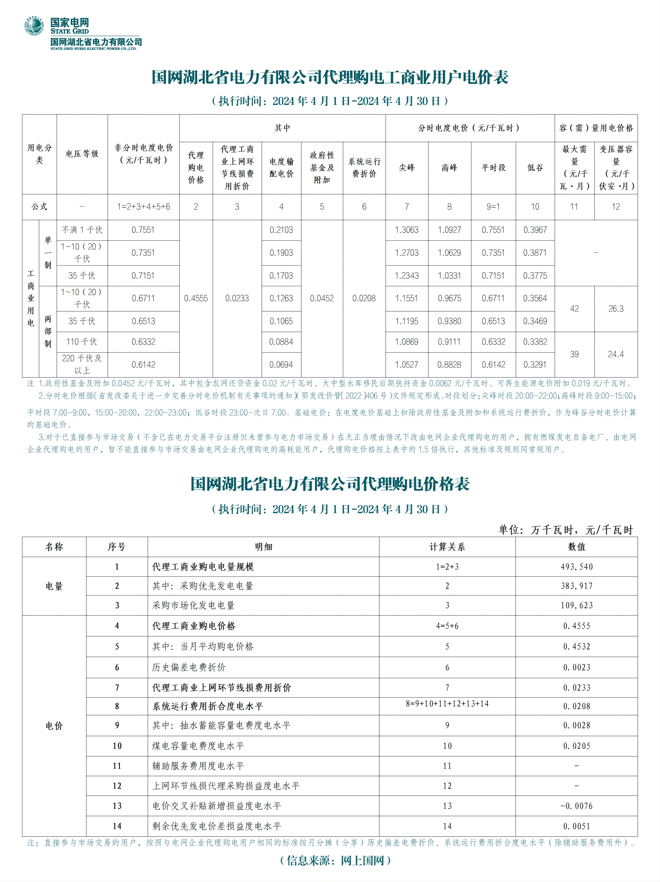 湖北省4月份代理購電工商業(yè)用戶電價表