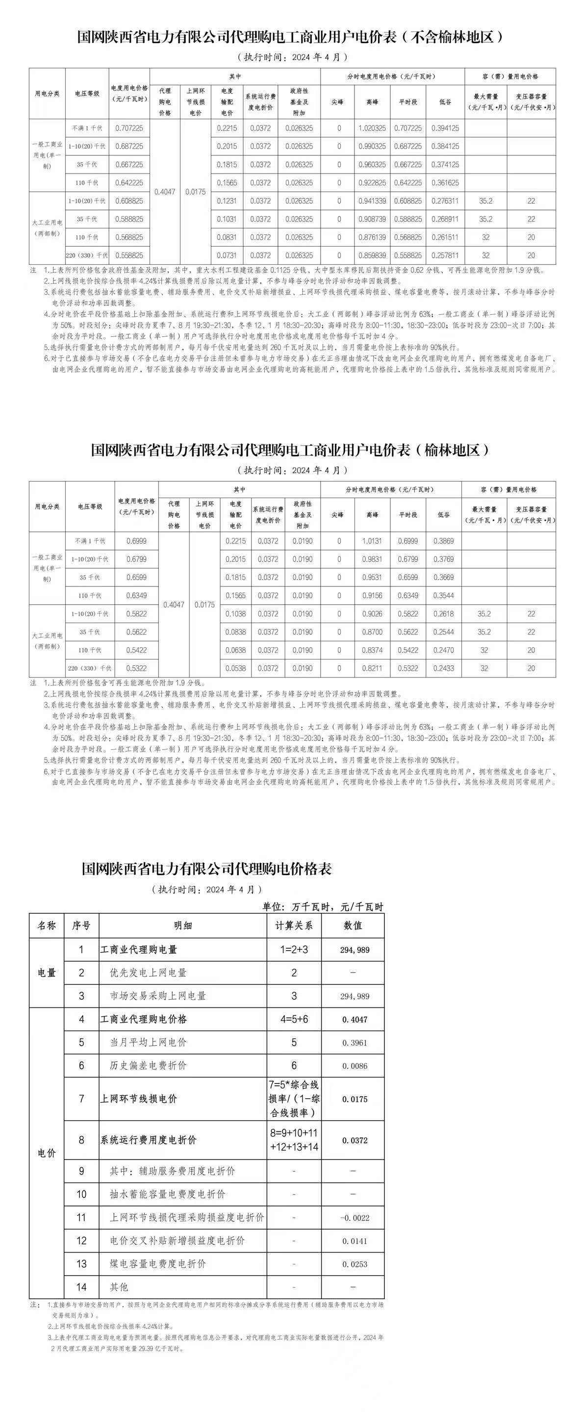 陜西省4月份代理購(gòu)電工商業(yè)用戶電價(jià)表