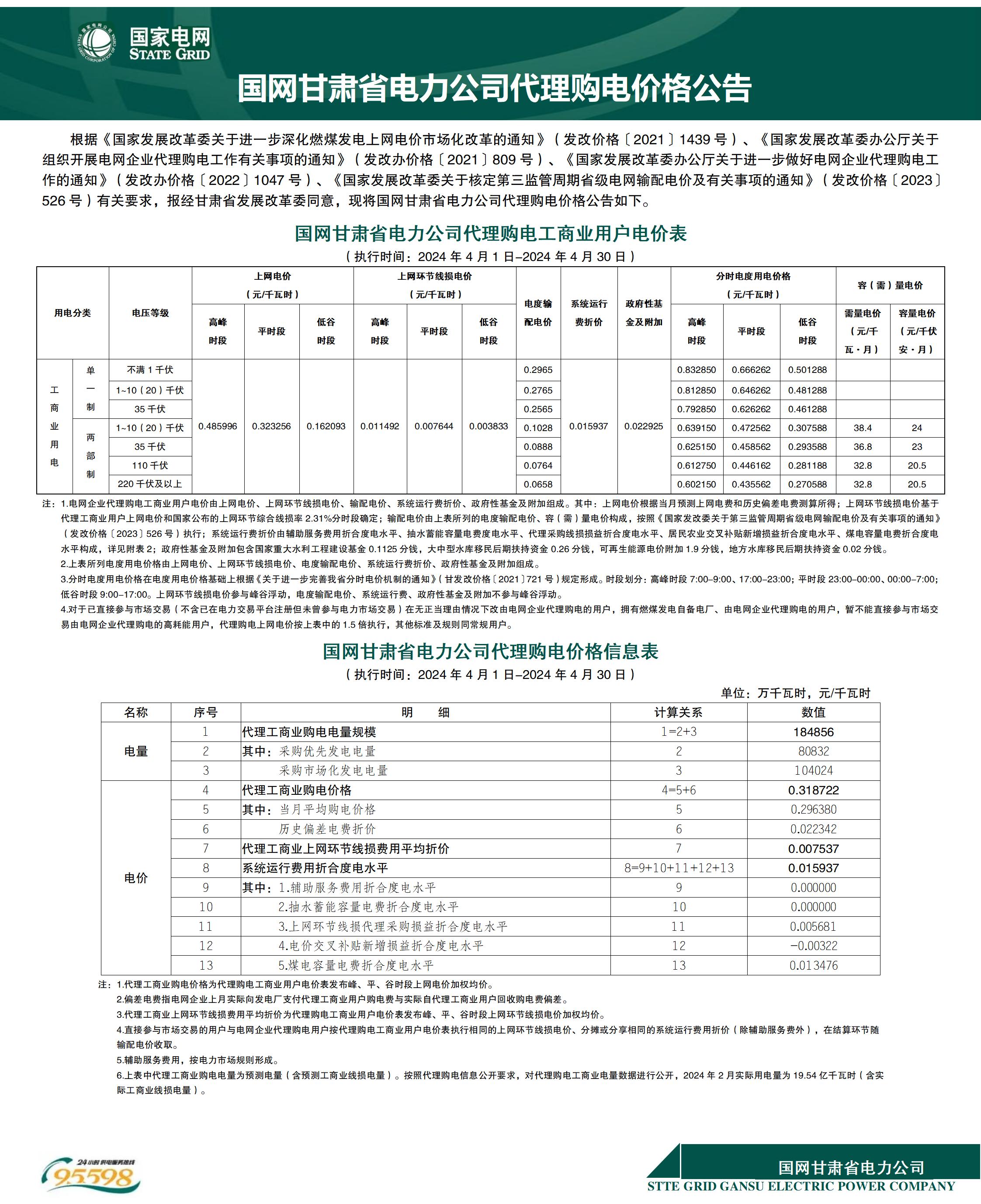 甘肅省4月份代理購(gòu)電工商業(yè)用戶電價(jià)表