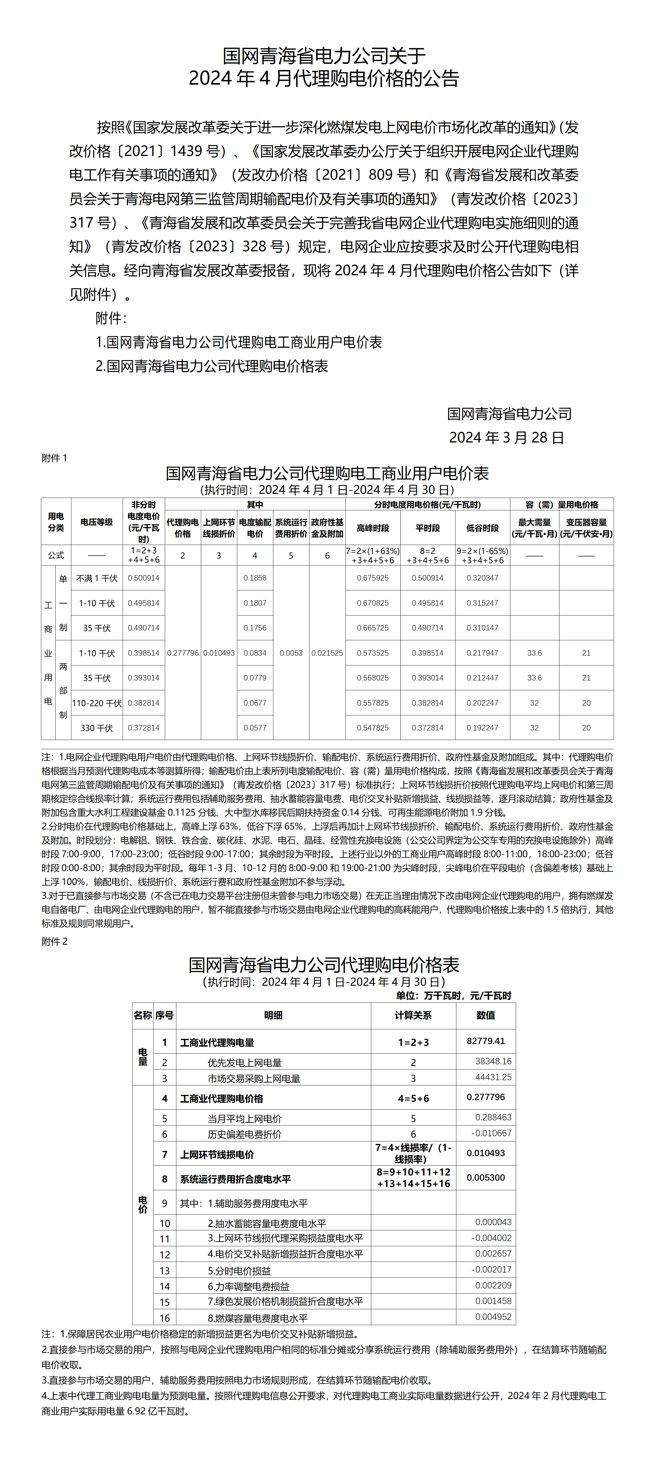 青海省4月份代理購(gòu)電工商業(yè)用戶電價(jià)表