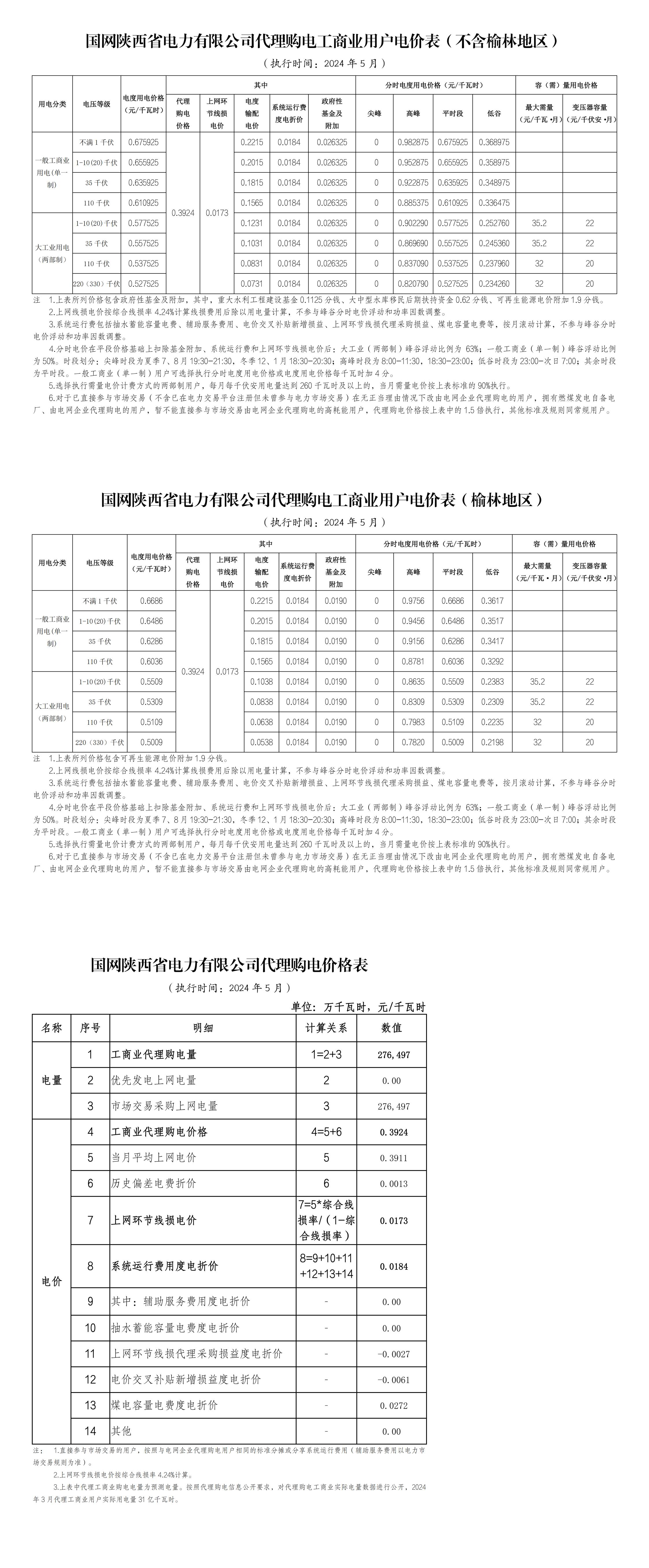 陜西省5月份代理購電工商業(yè)用戶電價(jià)表