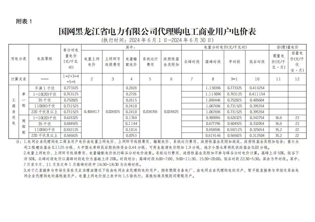 黑龍江省6月份代理購電工商業(yè)用戶電價表