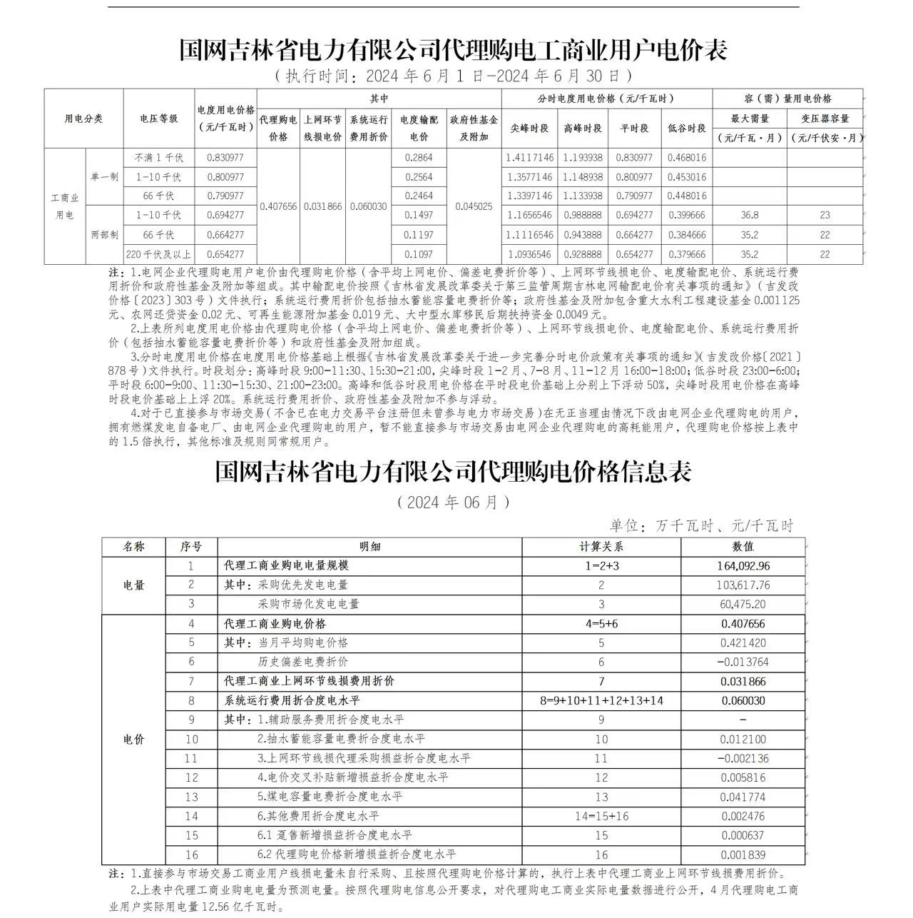 吉林省6月份代理購電工商業(yè)用戶電價表
