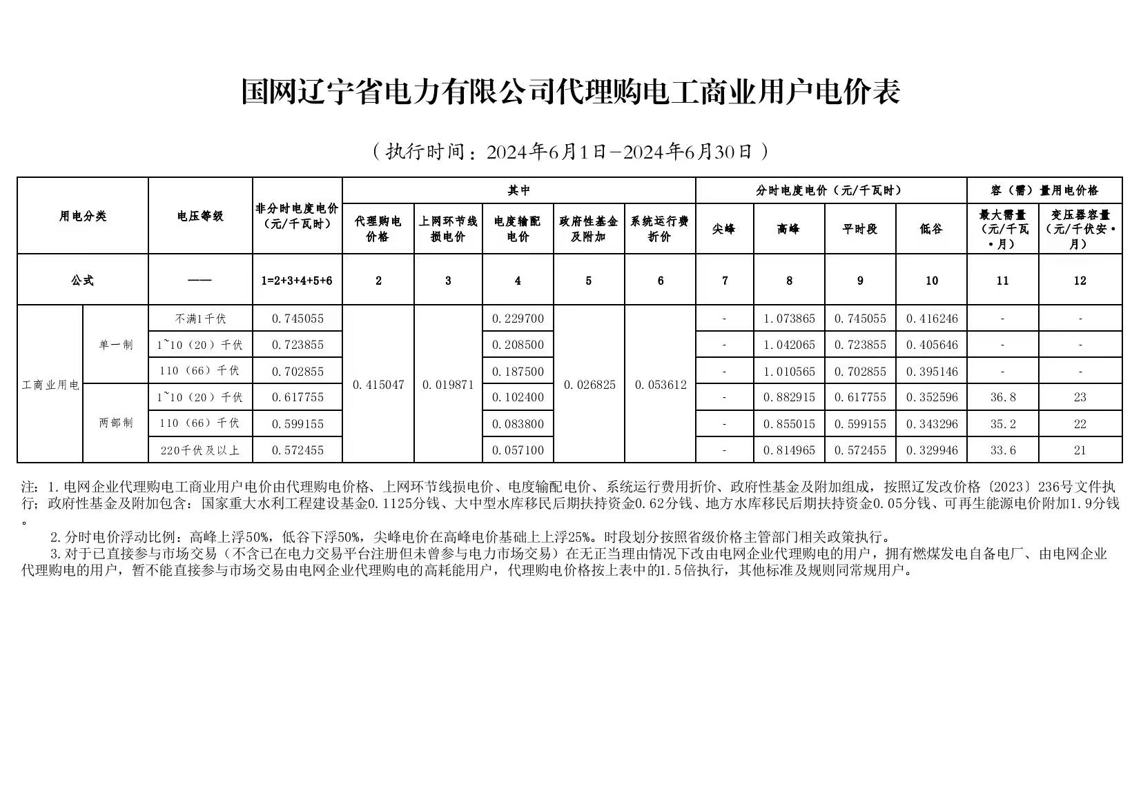遼寧省6月份代理購電工商業(yè)用戶電價表
