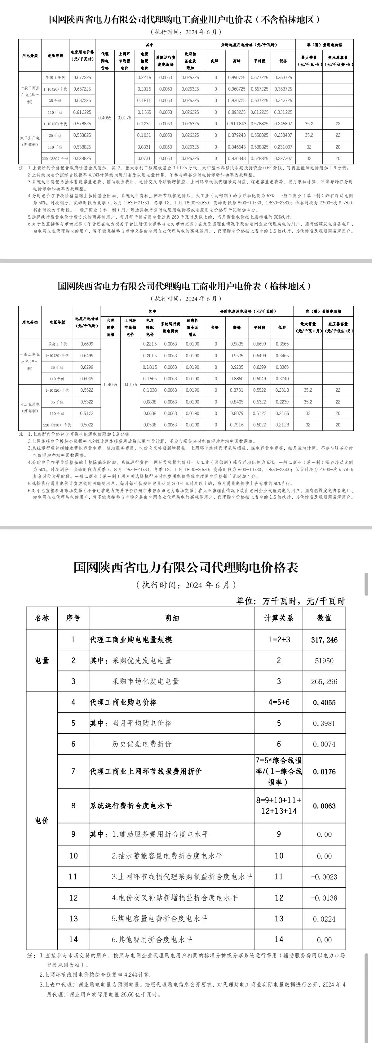 陜西省6月份代理購電工商業(yè)用戶電價表