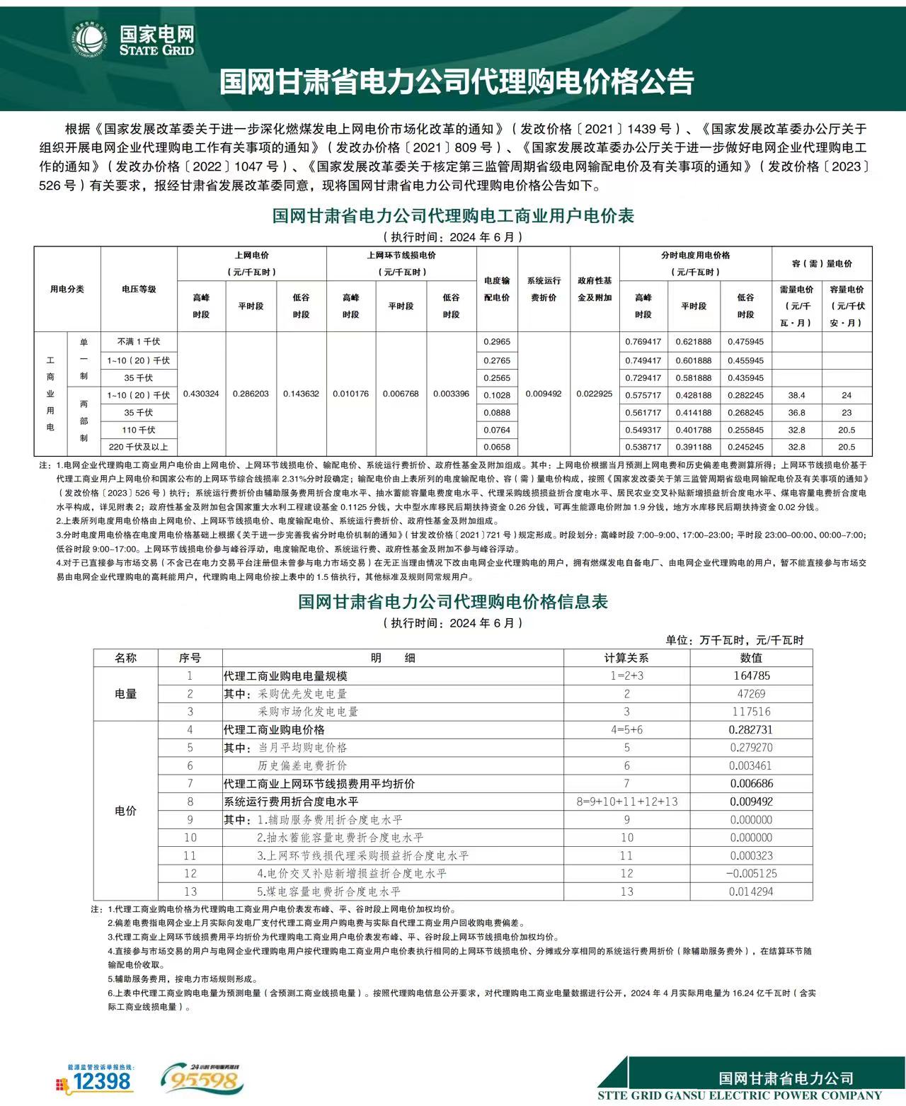 甘肅省6月份代理購電工商業(yè)用戶電價表