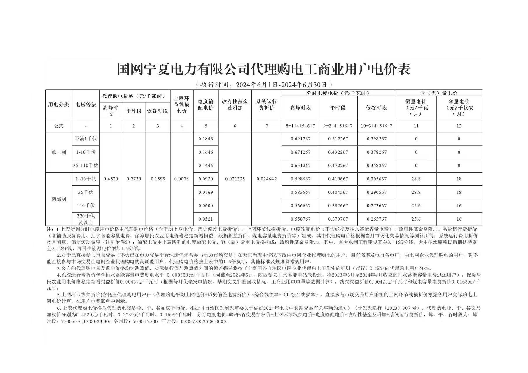 寧夏6月份代理購電工商業(yè)用戶電價表