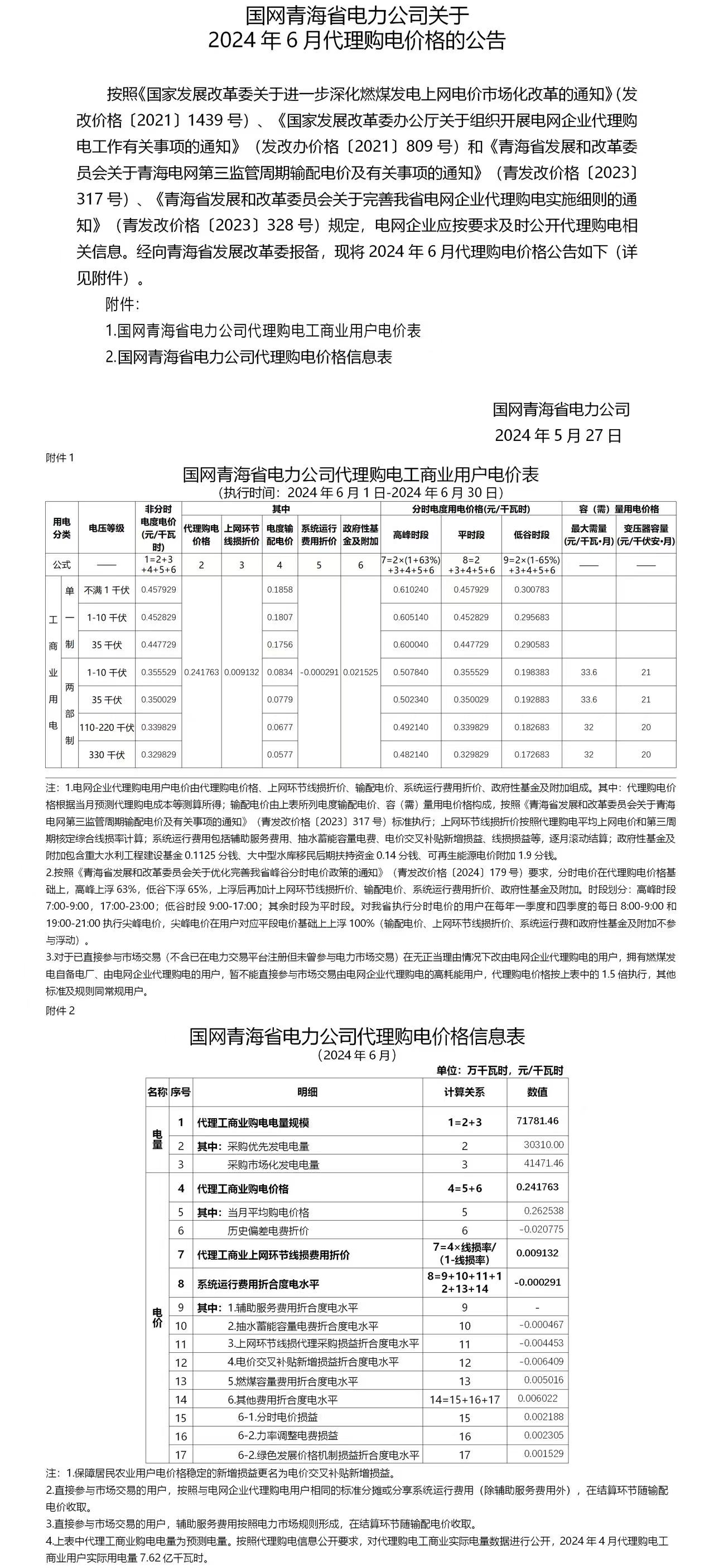 青海省6月份代理購電工商業(yè)用戶電價表