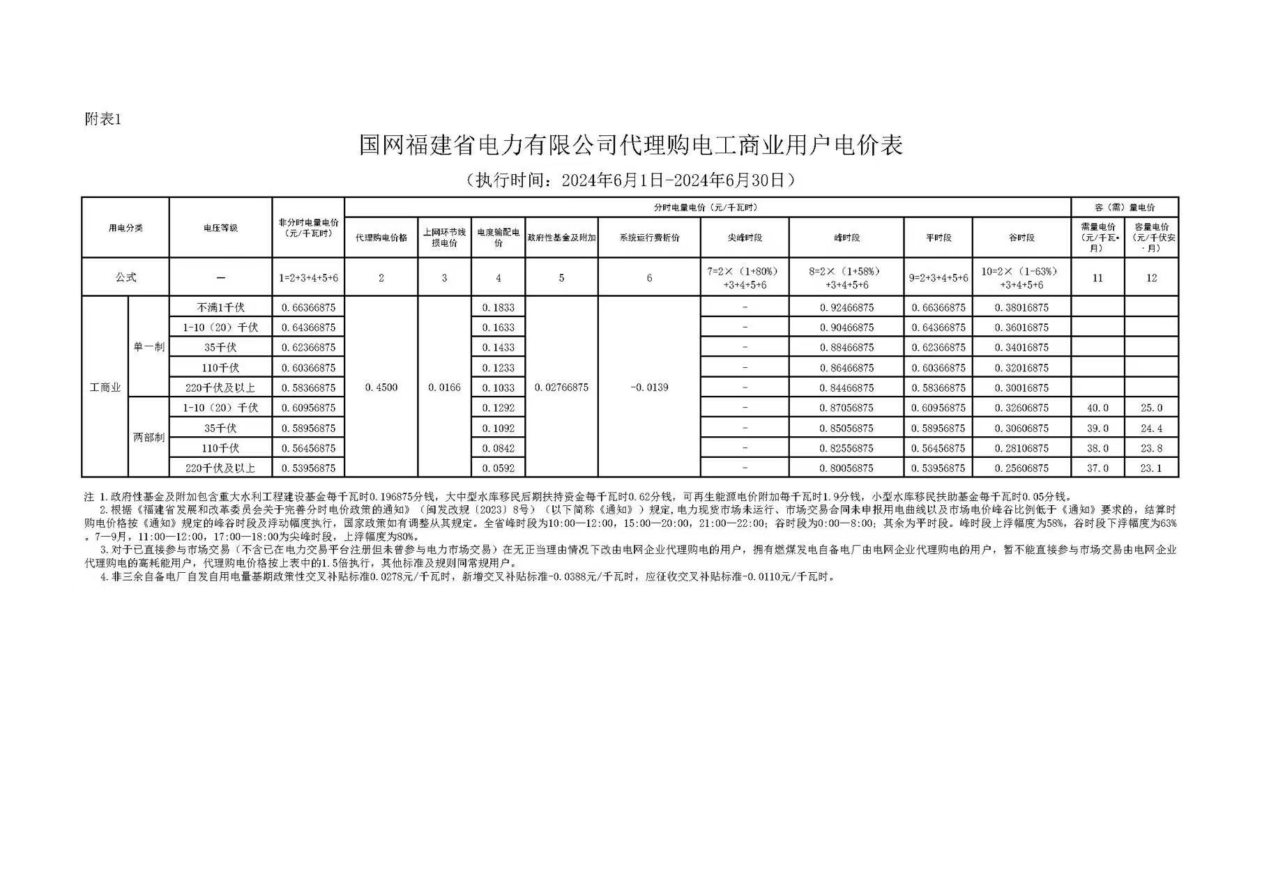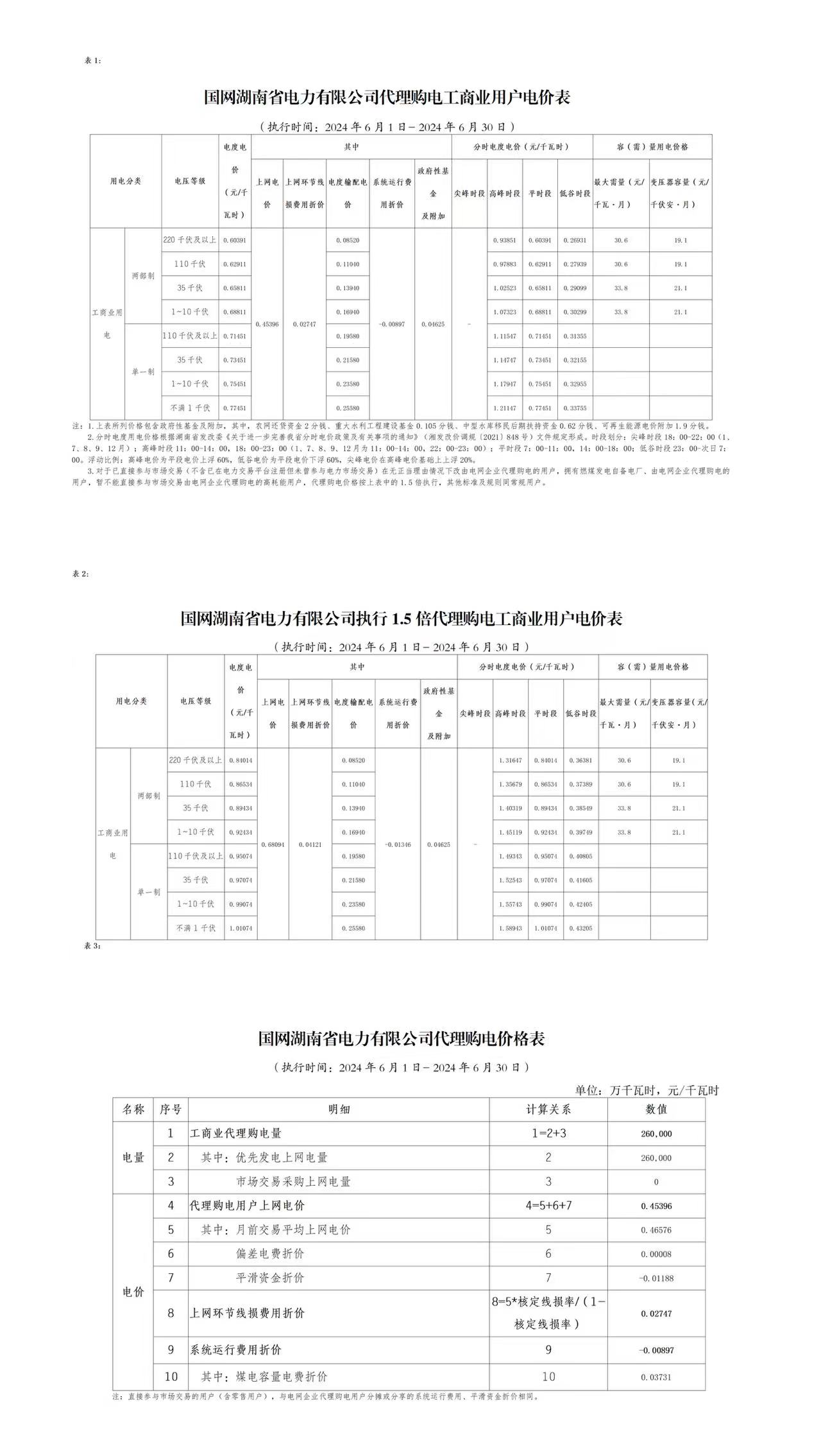 湖南省6月份代理購電工商業(yè)用戶電價表