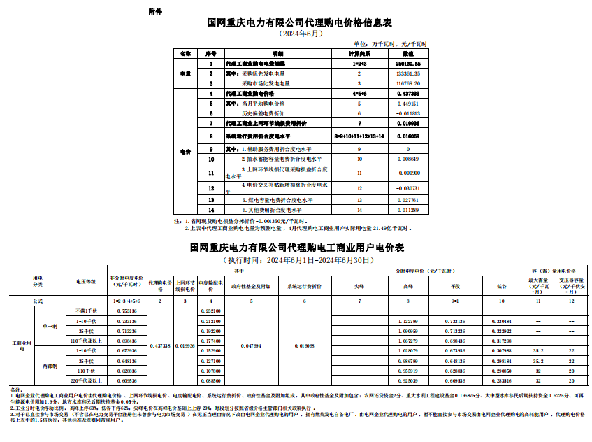 重慶市6月份代理購電工商業(yè)用戶電價表