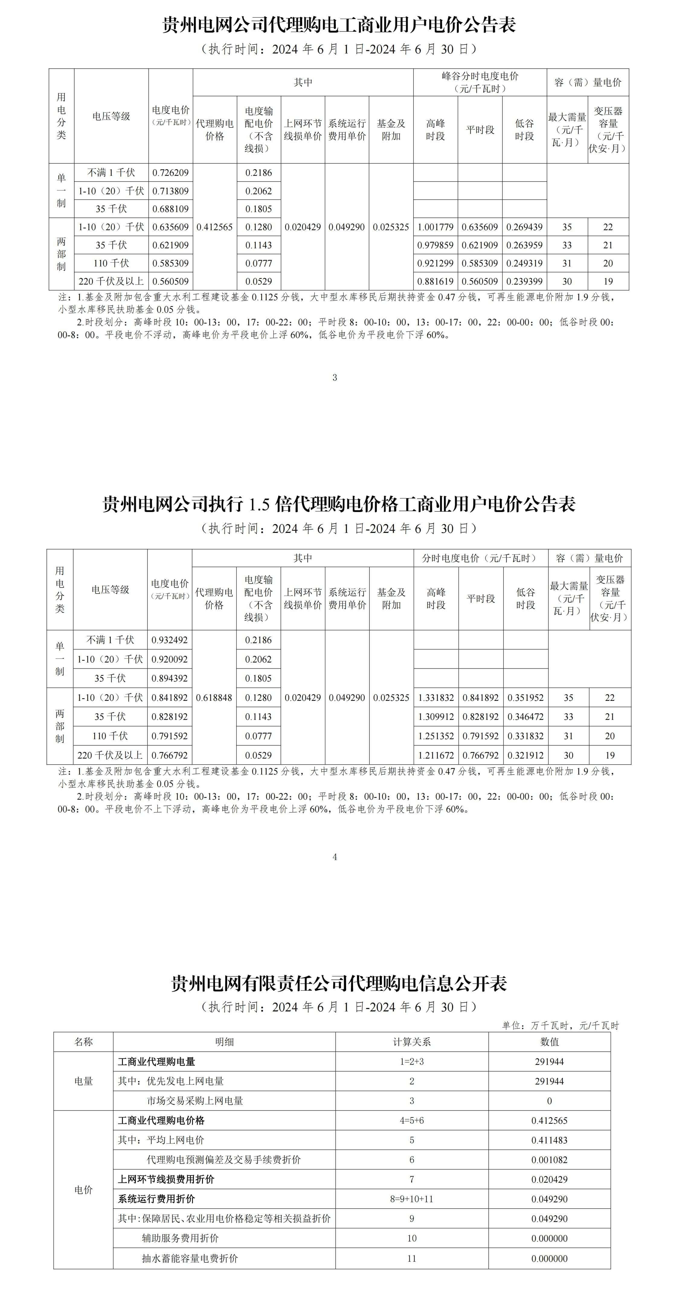 貴州省6月份代理購電工商業(yè)用戶電價(jià)表