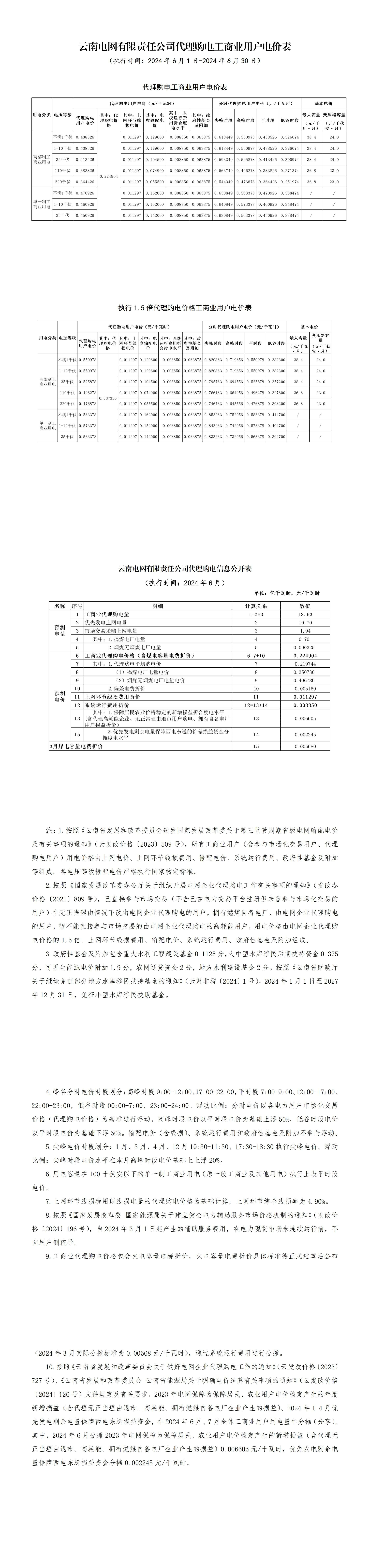 云南省6月份代理購電工商業(yè)用戶電價(jià)表