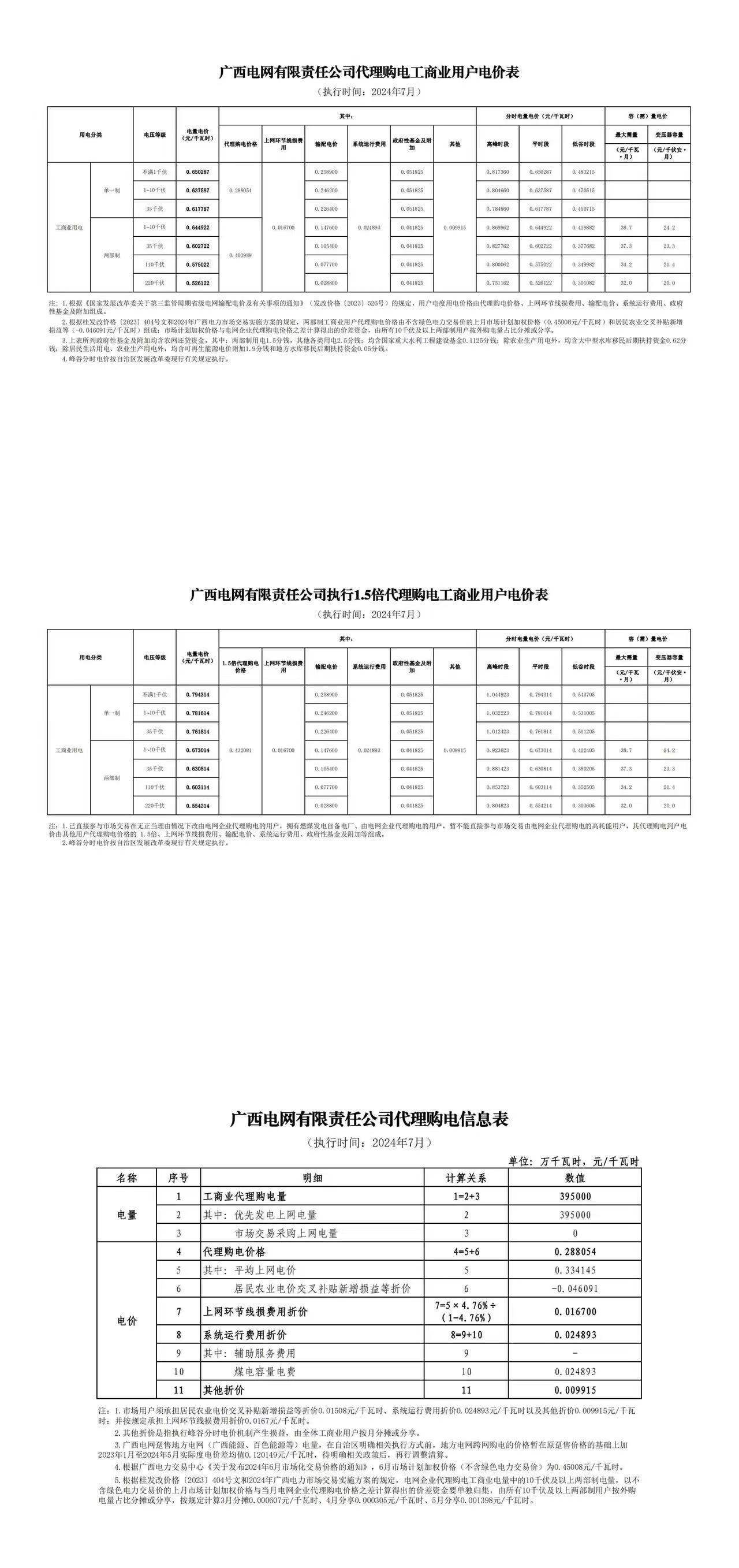 廣西省7月份代理購(gòu)電工商業(yè)用戶電價(jià)表