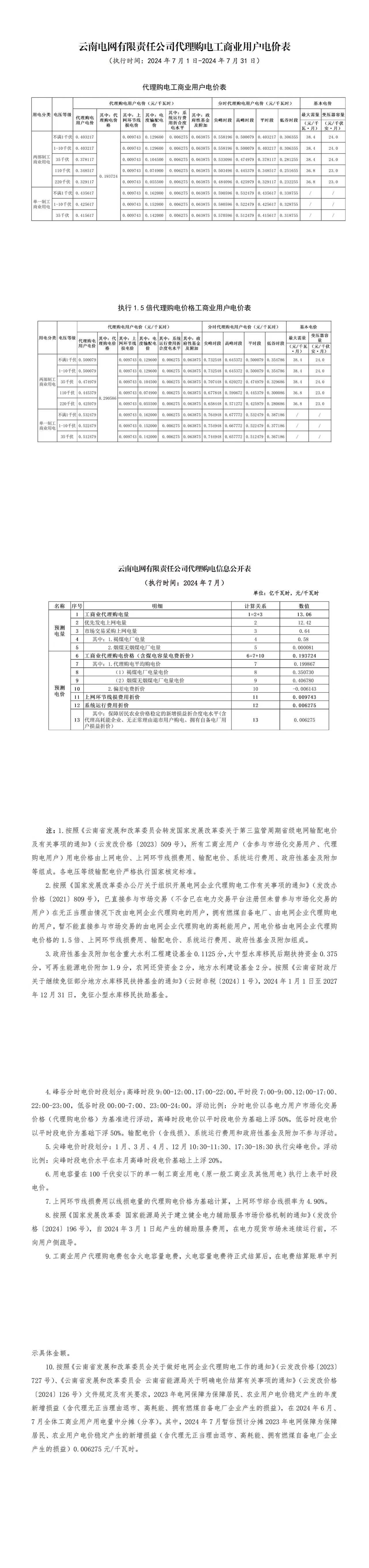 云南省7月份代理購(gòu)電工商業(yè)用戶電價(jià)表