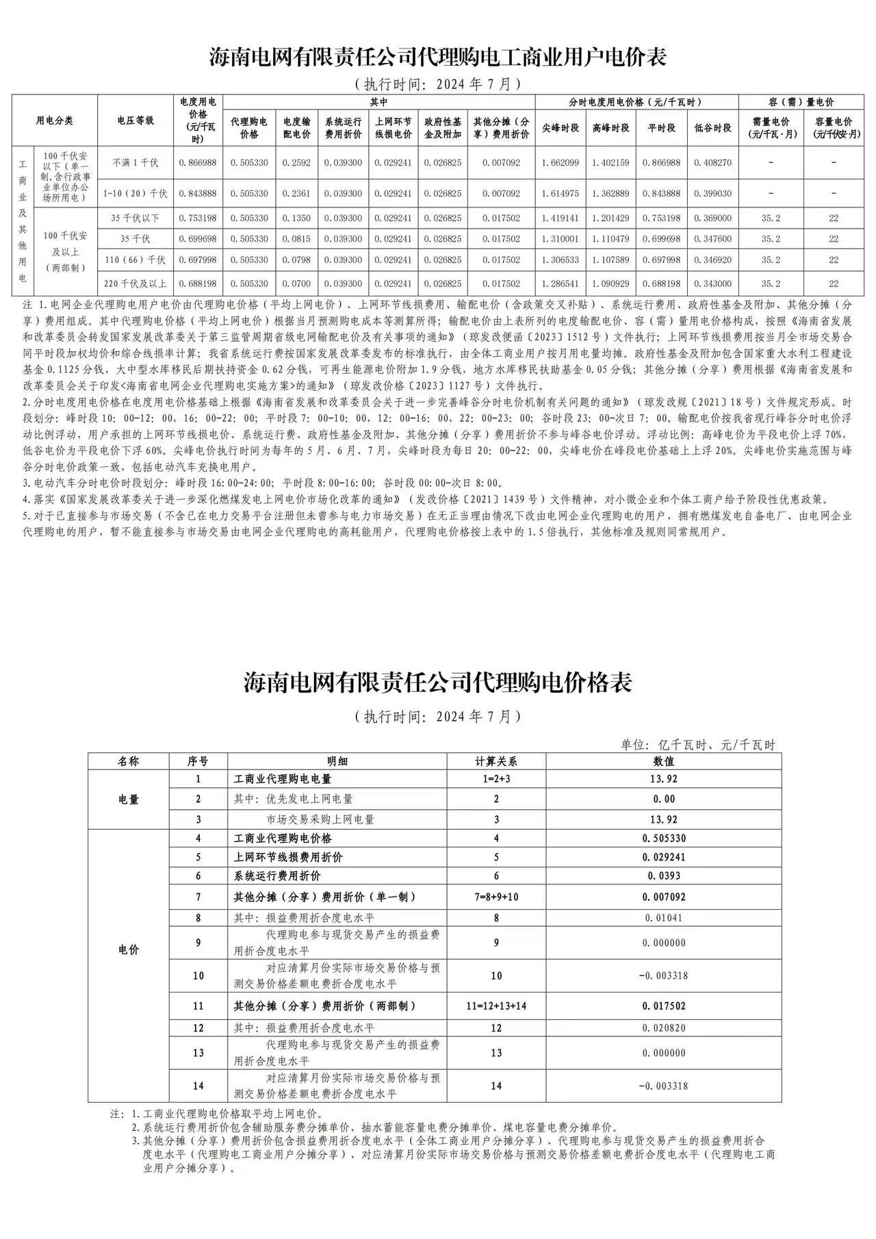 海南省7月份代理購(gòu)電工商業(yè)用戶電價(jià)表