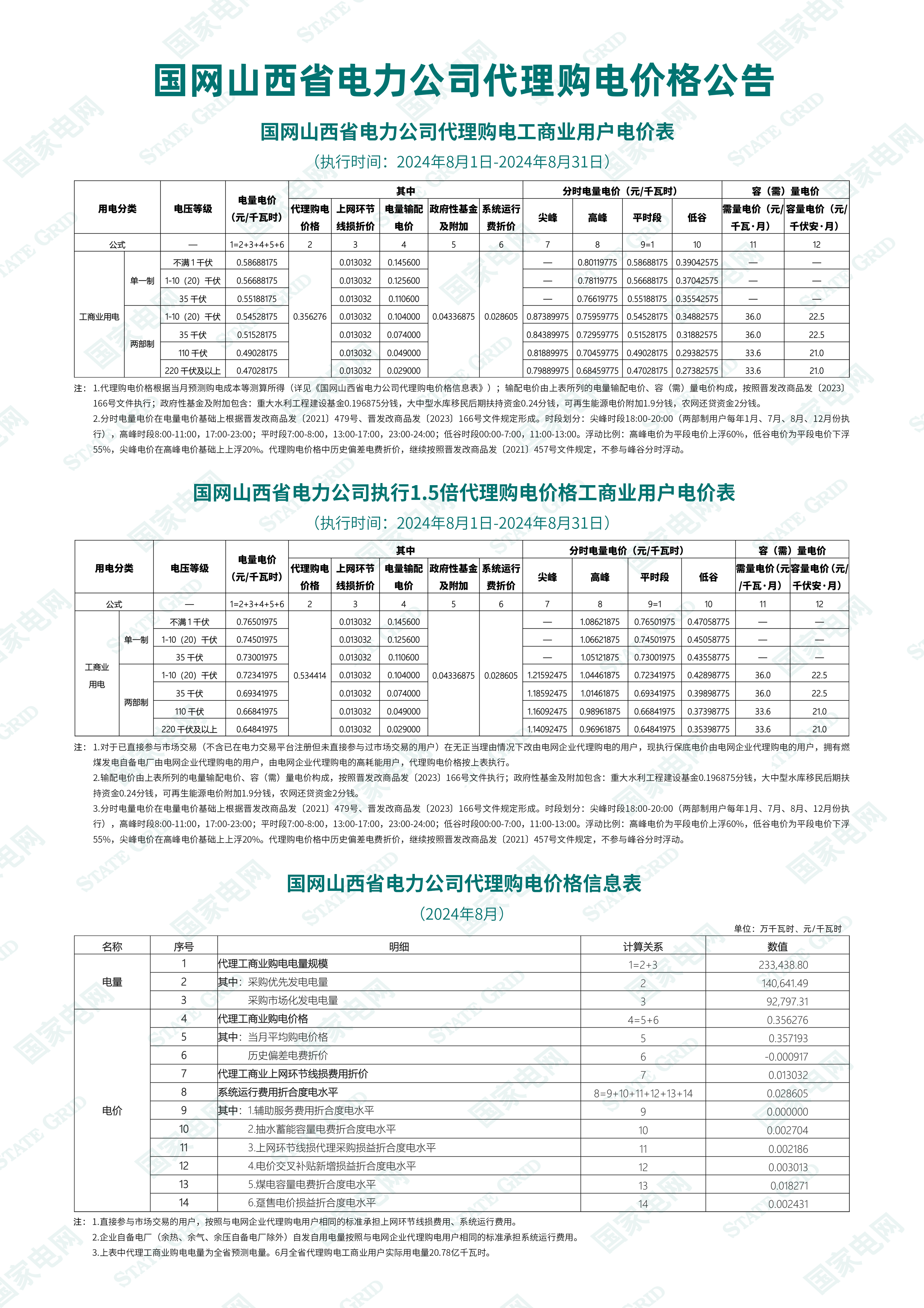 山西省8月份代理購電工商業(yè)用戶電價表