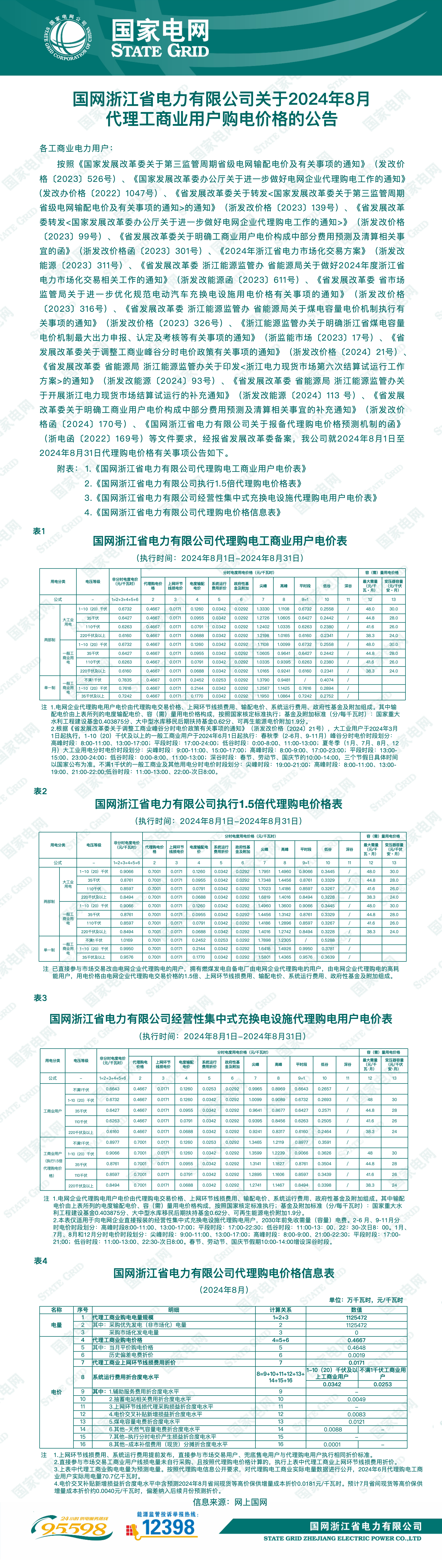 浙江省8月份代理購電工商業(yè)用戶電價(jià)表