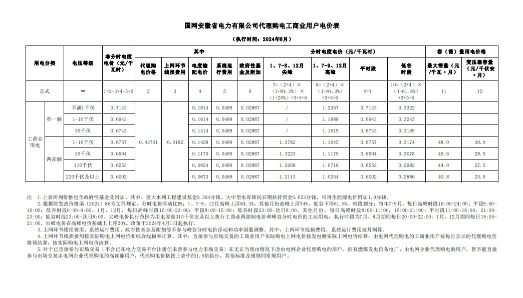 安徽省8月份代理購電工商業(yè)用戶電價(jià)表