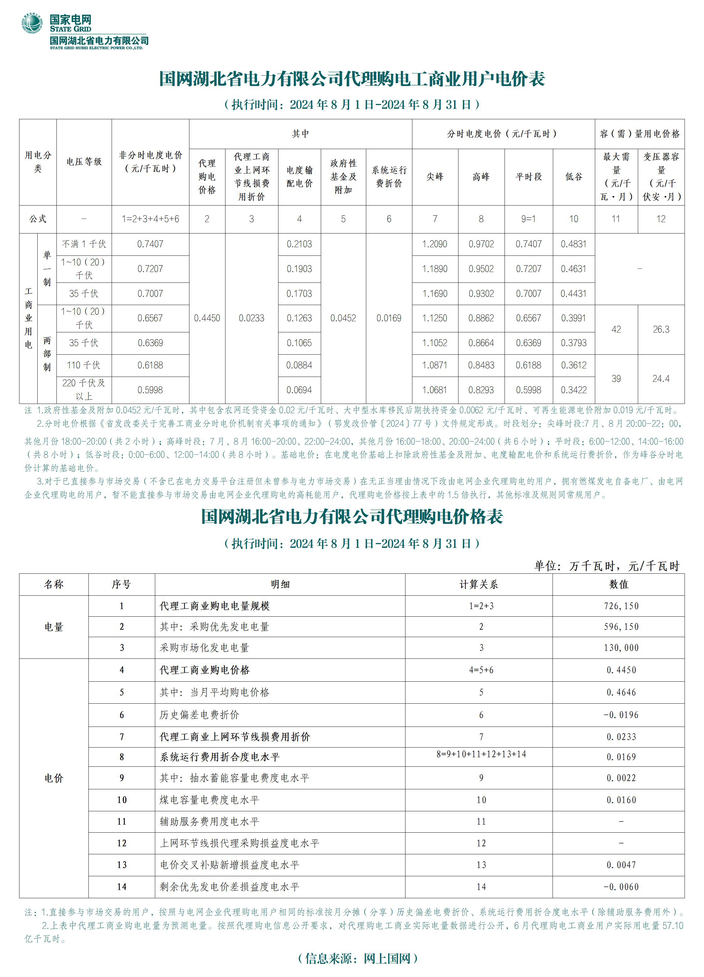 湖北省8月份代理購電工商業(yè)用戶電價(jià)表