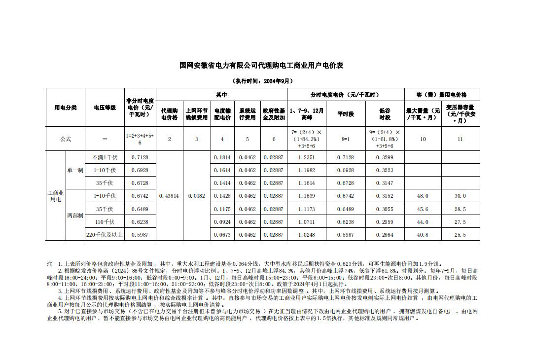 安徽省9月份代理購電工商業(yè)用戶電價表