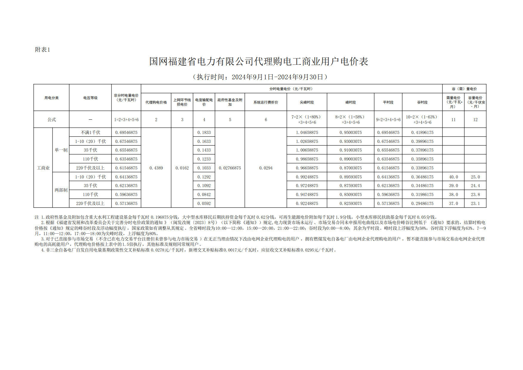 福建省9月份代理購(gòu)電工商業(yè)用戶電價(jià)表
