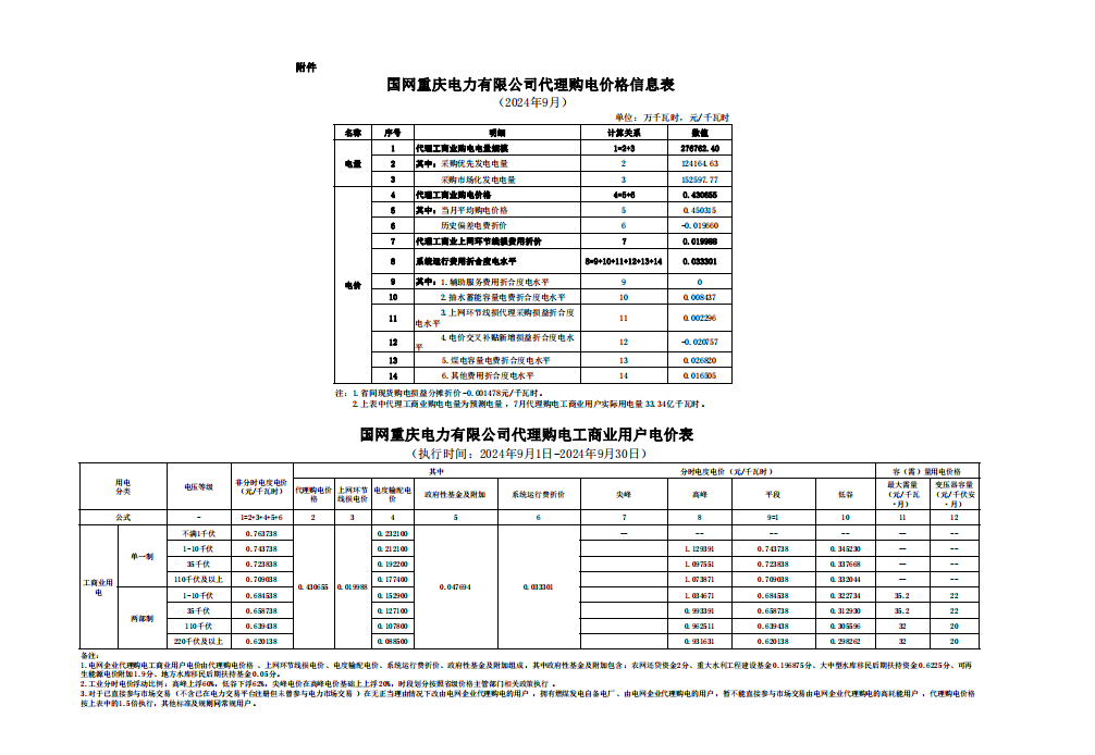 重慶市9月份代理購(gòu)電工商業(yè)用戶電價(jià)表