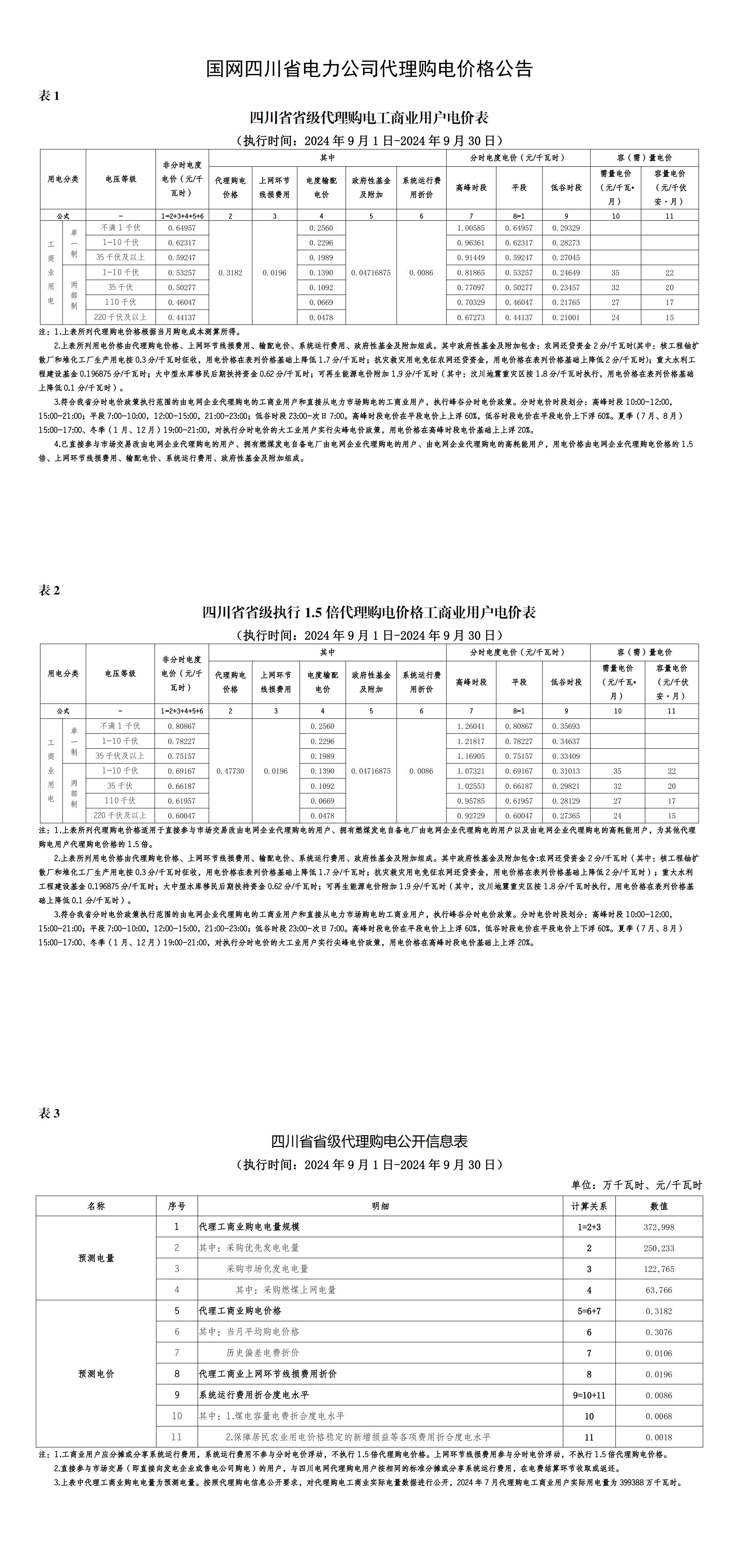 四川省9月份代理購(gòu)電工商業(yè)用戶電價(jià)表