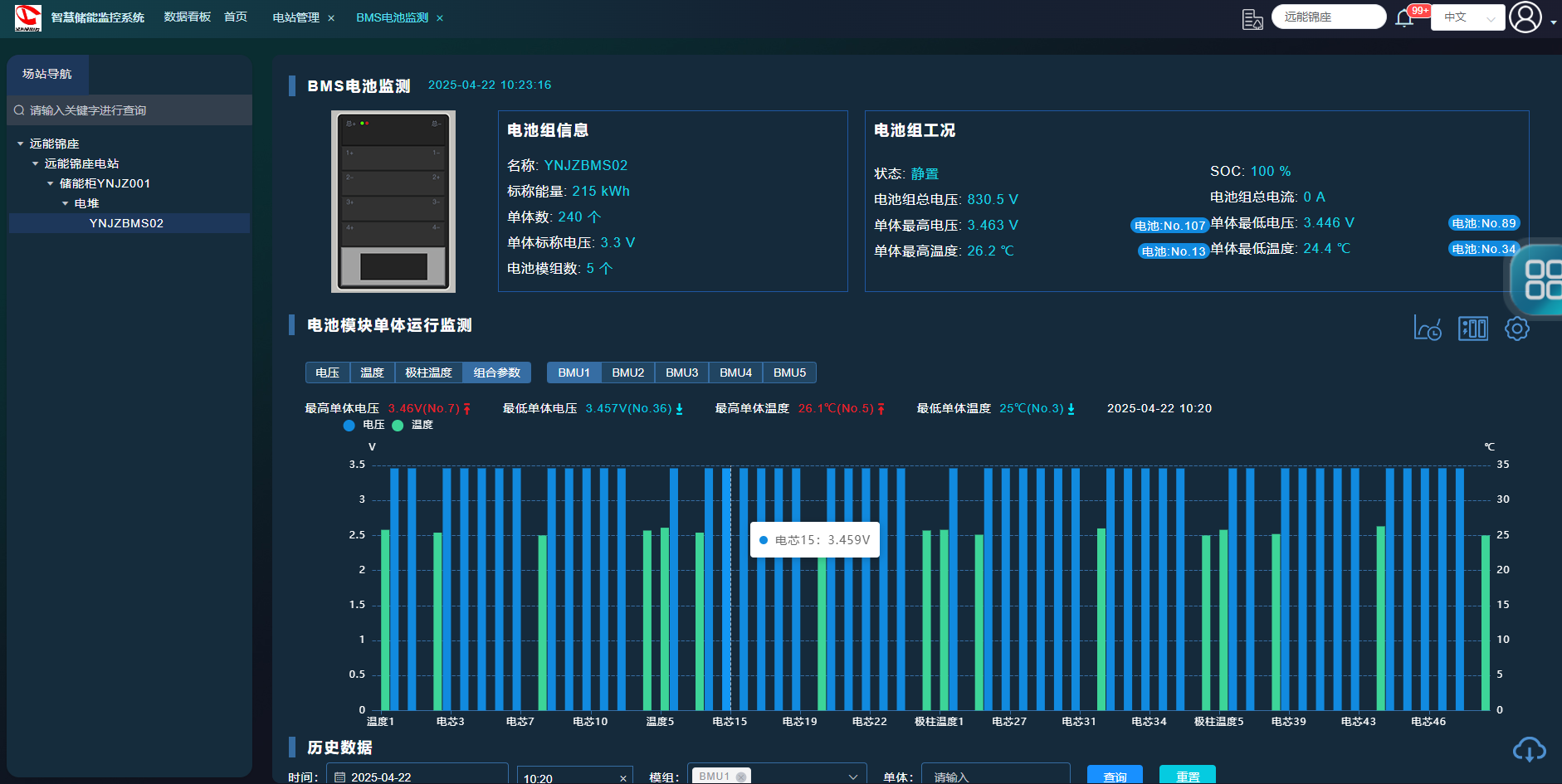 實時狀態(tài)監(jiān)測:集中監(jiān)控系統(tǒng)能夠?qū)崟r掌握儲能電站內(nèi)各組件的運行參數(shù),如電池的電壓、電流、溫度、SOC(荷電狀態(tài)),以及變流器的功率轉(zhuǎn)換效率等。這種實時監(jiān)控功能不僅提高了運維效率,還減少了人工巡檢的需求。