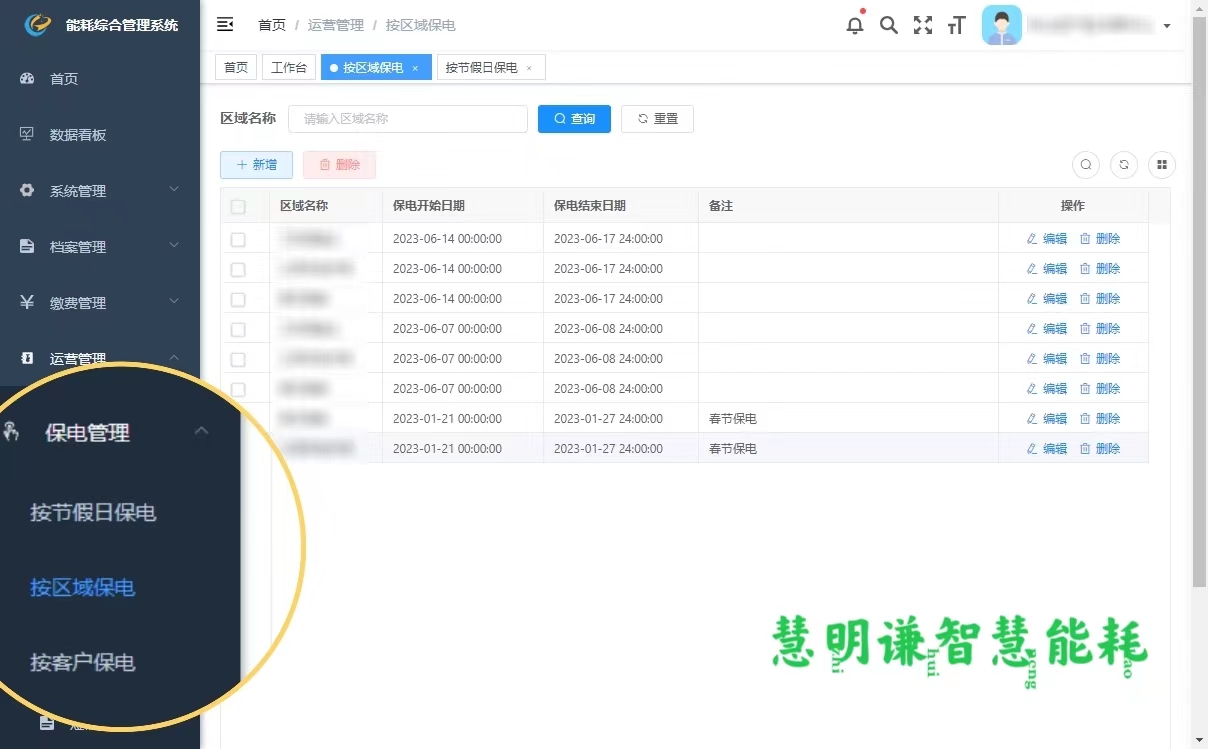 在左側功能菜單中,“運營管理”下的“保電管理”,有三個保電方式可選,“按節(jié)假日保電”、“按區(qū)域保電”和“按客戶保電”,根據(jù)需要,可設置不同的保電方案。