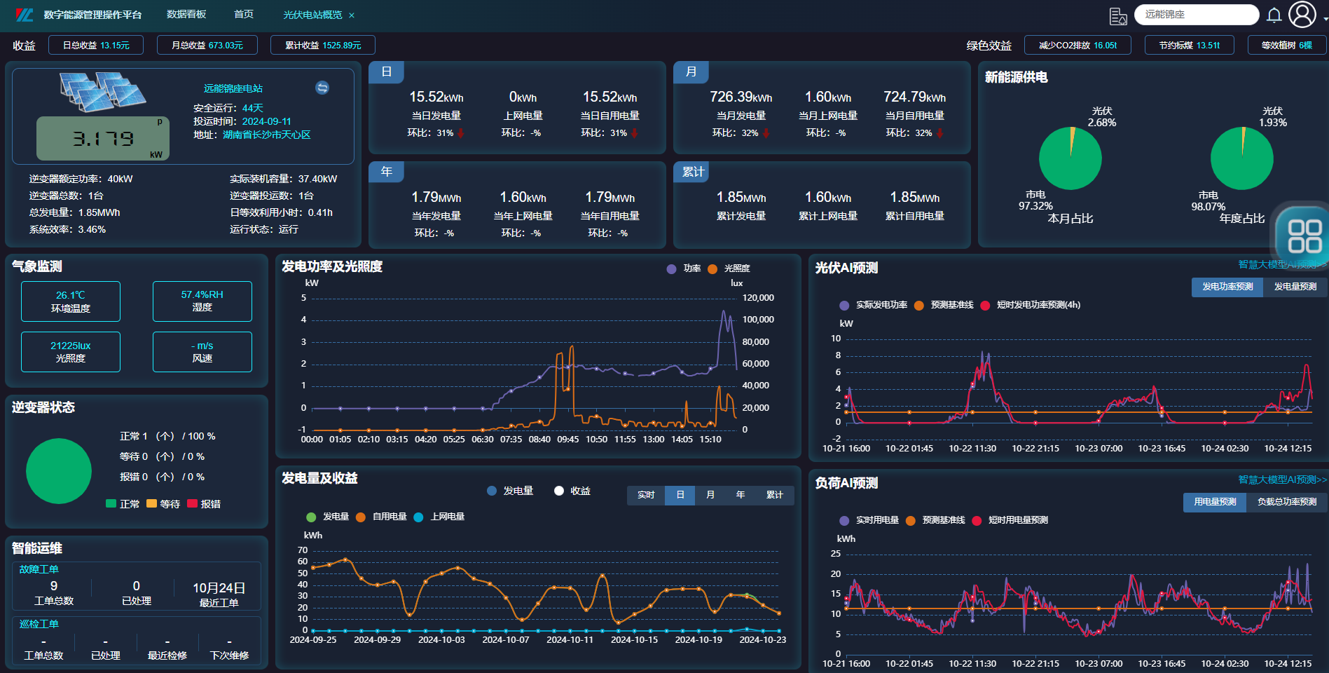 在湖南慧明謙數(shù)字能源技術(shù)有限公司的數(shù)字能源操作管理平臺中,智慧光伏系統(tǒng)猶如一位全能的“智能管家”,為光伏電站的高效、穩(wěn)定運行保駕護(hù)航。它憑借一系列卓越的功能和顯著的價值,為光伏行業(yè)的發(fā)展注入了強(qiáng)勁動力。