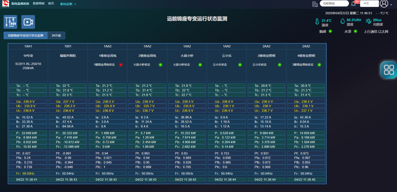 1、展示變配電站內(nèi)的環(huán)境狀態(tài)(包括當(dāng)前環(huán)境溫度值、濕度值、水浸、煙感、開關(guān)門狀態(tài)、當(dāng)日溫度曲線、當(dāng)日濕度曲線等)。