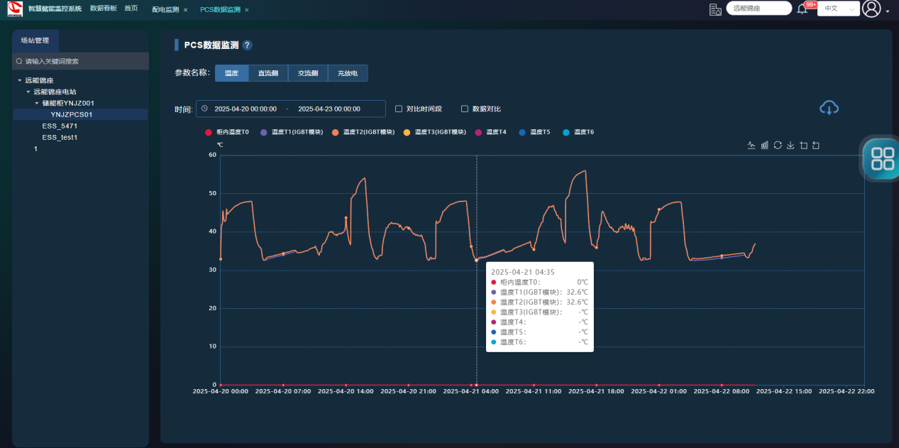 3、可切換展示PCS的交流側(cè)有功功率和直流側(cè)功率信息,曲線展示PCS的交流側(cè)、負(fù)載側(cè)、電網(wǎng)側(cè)有功功率、充放電量和充放電功率信息。