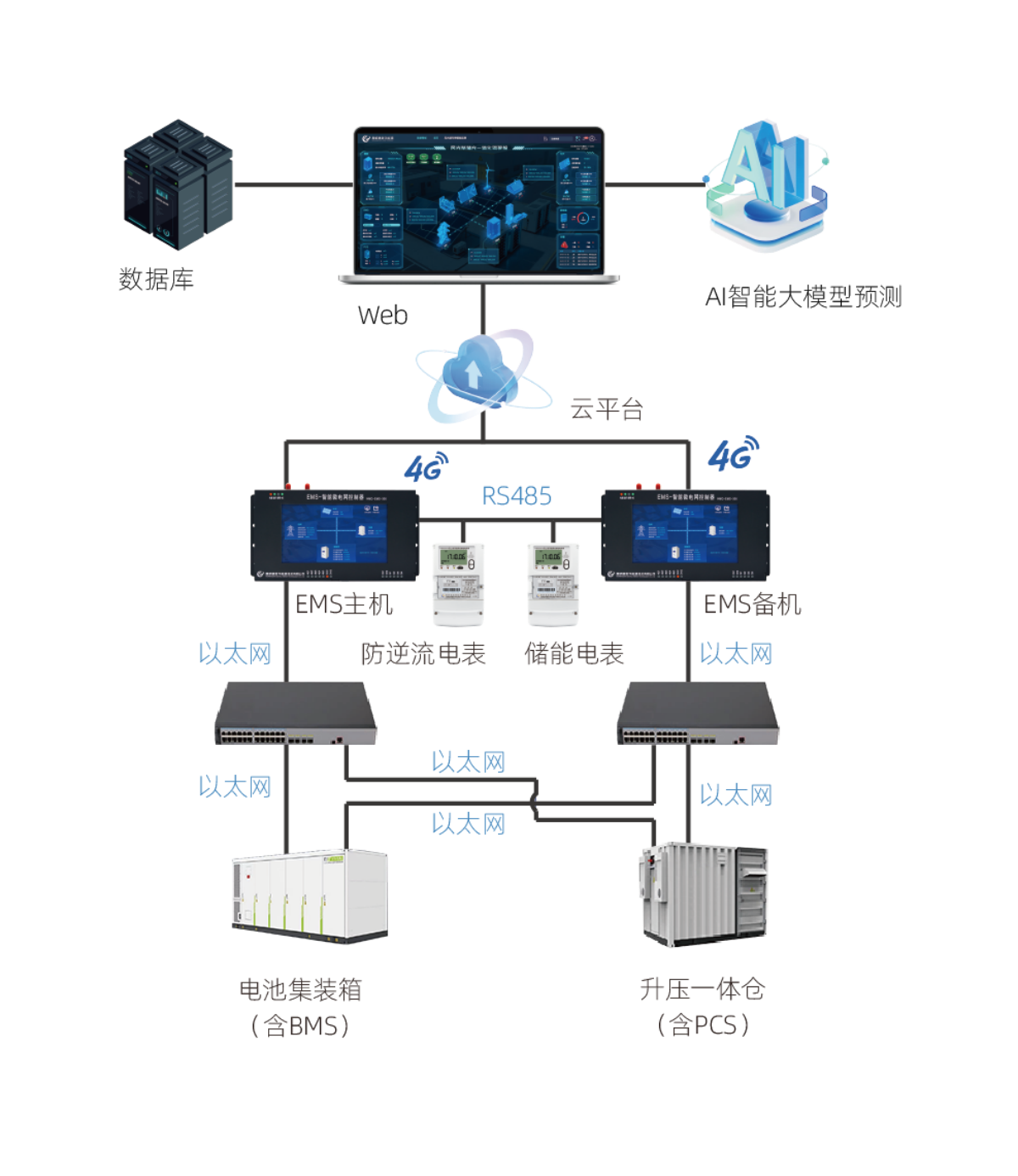 邊側(cè):EMS主機(jī)和備機(jī)作為邊緣控制器,實時處理本地數(shù)據(jù),執(zhí)行控制策略,并通過4G/以太網(wǎng)與云端通信。